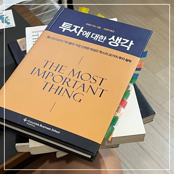 '투자에 대한 생각'에서 하워드 막스는 투자자들이 성공하기 위해서는 가치 투자에 중점을 두어야 한다고 주장합니다. 가치 투자란 기업의 내재 가치보다 낮은 가격에 거래되는 주식을 매수하는 투자 전략으로 볼 수 있을 것 같습니다. 막스는 가치 투자가 장기적으로 성공할 수 있는 유일한 투자 전략이라고 믿고 있는 것 같습니다. 막스는 오크트리 캐피털 매니지먼트의 공동 설립자이자 투자 파트너입니다. 그는 40 년 이상 투자 업계에서 일했으며 , 그동안 여러 권을 집필했습니다. 그의 가장 유명한 책은 '투자에 대한 생각'으로, 투자에 관한 그의 철학을 담고 있습니다. 책뿐만 아니라, 소셜미디어에서도 열심히 활동을 하고 있습니다.